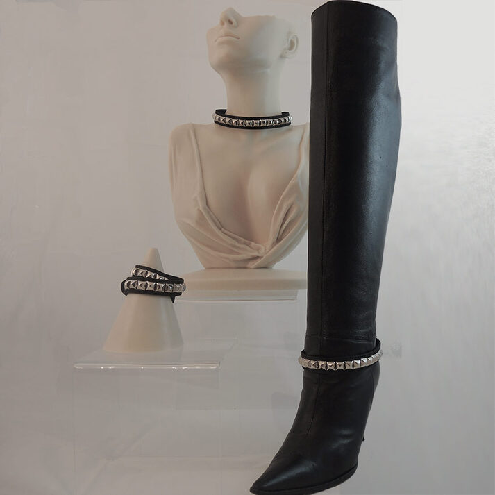 Schuhgürtel mit 1cm-Pyramiden aus Sauvage-Leder, handgefertigt. Kann als Stiefelband, Halsband oder Armband getragen werden. Durch die Gürtelschließe variabel in der Länge einstellbar.