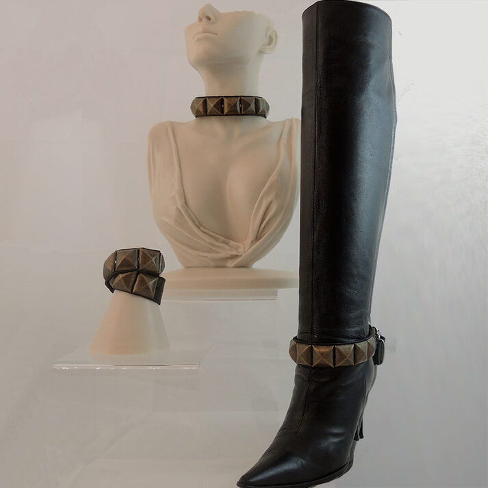 Schuhgürtel mit großen 2,5cm-Pyramiden aus Sauvage-Leder, handgefertigt. Kann als Stiefelband, Halsband oder Armband getragen werden. Durch die Gürtelschließe variabel in der Länge einstellbar.