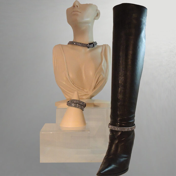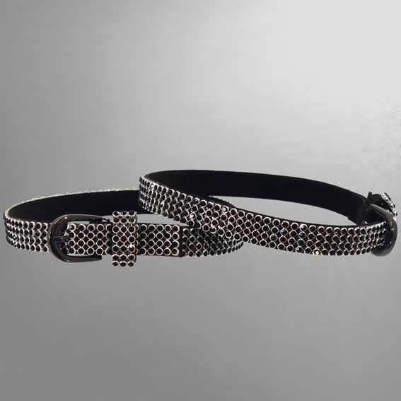 Glamour-Accessoire: Schuh-Gürtel aus Mikrofaser. 4 Reihen hochwertiger Kristall-Strass. Kann als Stiefelband, Halsband oder Armband getragen werden. Durch Gürtelschließe variabel in der Länge einstellbar.