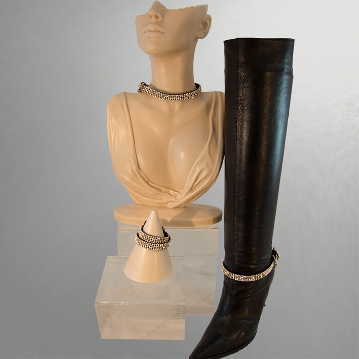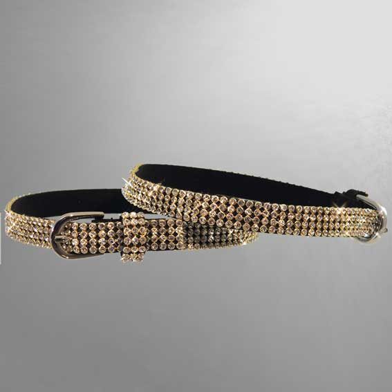 Glamour-Accessoire: Stiefelband aus Mikrofaser. 4 Reihen hochwertiger Kristall-Strass glitzert in allen Regenbogenfarben. Kann als Stiefelband, Halsband oder Armband getragen werden. Durch Gürtelschließe variabel in der Länge einstellbar.