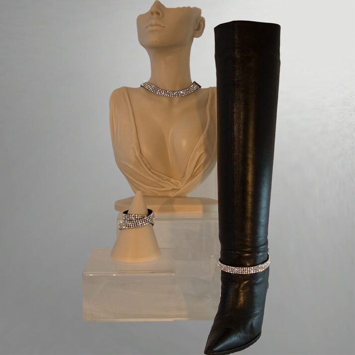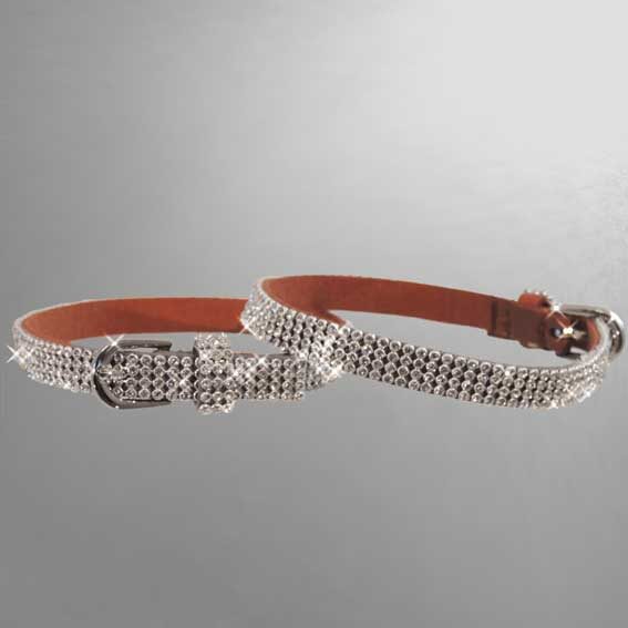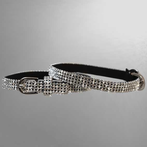 Glamour-Accessoire: Stiefelband aus Mikrofaser. 4 Reihen hochwertiger Kristall-Strass glitzert in allen Regenbogenfarben. Kann als Stiefelband, Halsband oder Armband getragen werden. Durch Gürtelschließe variabel in der Länge einstellbar.