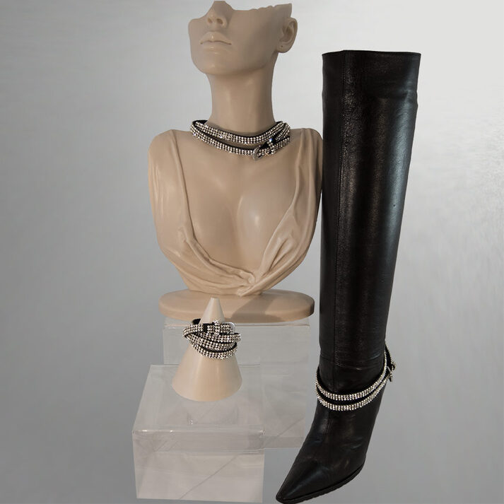 Schuh-Gürtel als Glamour-Accessoire. Wickelband aus Mikrofaser. Kann als Stiefelband, Halsband oder Armband getragen werden. 3 Reihen hochwertiger Kristall-Strass mit BLING!-Faktor. Durch Gürtelschließe variabel in der Länge einstellbar.
